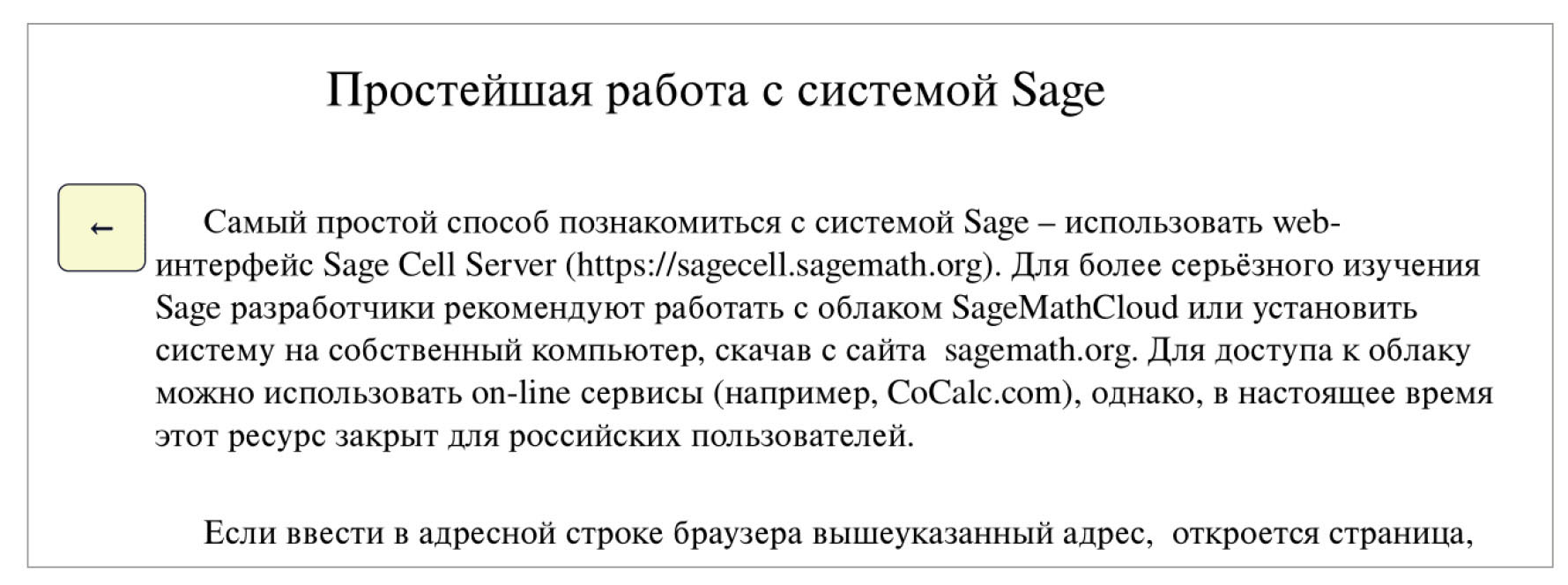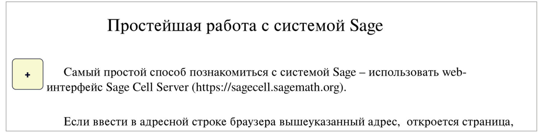 С использованием редактора 3Е было создано расширяемое эссе, посвященное основам работы с системой компьютерной алгебры Sage. При написании эссе мы опирались на книги В. Штейна [9], П. Циммермана и др. [10], A. Зобнина и др. [11] и использовали документацию сайта системы Sage [12]. В эссе описаны элементарные средства Sage и показана работа с многочленами и с матрицами.