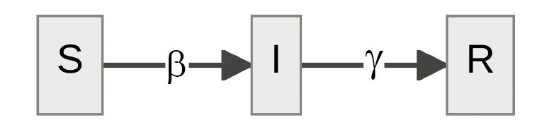 Классической моделью эпидемии является модель SIR, предложенная В. Кермаком и А. МакКендриком [28]. В этой модели различают три состояния индивидуумов: S – восприимчивый, I – инфицированный, R – выздоровевший (или невосприимчивый). Процессы, характерные для модели SIR, могут быть представлены диаграммой на рис. 1, где β – интенсивность заражения, γ – интенсивность выздоровления.