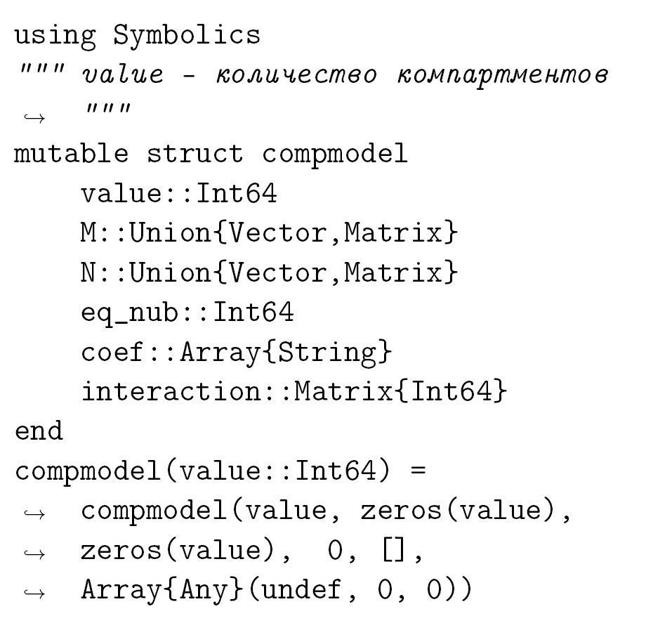 В следующем разделе мы анализируем такие возможности и особенности языка Julia и системы компьютерной алгебры Symbolics.jl, которые используются для программной реализации описанного подхода к построению компартментальных моделей.