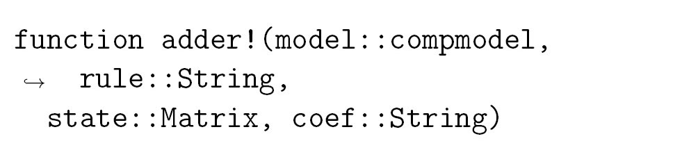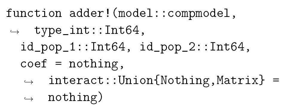В листинге 3 представлен заголовок метода, получающего следующие аргументы: модель, тип взаимодействий в символьной форме, фазовые переменные в символьной форме, коэффициент интенсивности переходов. Следует отметить, что обе реализации мультиметода являются in-place, т.е. изменяют состояние модели, при этом возвращается значение “nothing”.