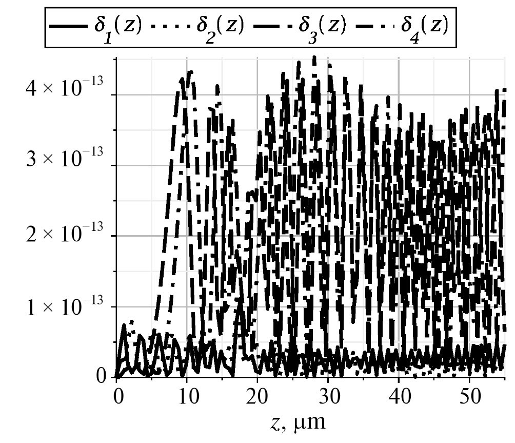 Рис. 5. Невязки δj(z), j = 1..4 для z ∈ [0,L] при значениях abserr и relerr, равных 10–12.