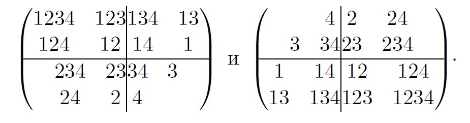 Для примера покажем, как записывается представление при . Размер таблицы равен 2 × 2 × 2. Запишем ее “слои”, индексированные вдоль третьей стороны (“глубины”), в виде расширенных квадратных матриц.