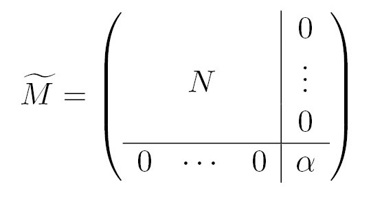 и через N обозначим подматрицу, получаемую удалением из матрицы M первого столбца и первой строки. Ранги матриц связаны равенством Матрица N блочно-диагональная с 2 × 2 блоками, каждый блок вырожденный. Поэтому её ранг равен числу блоков: Следовательно,