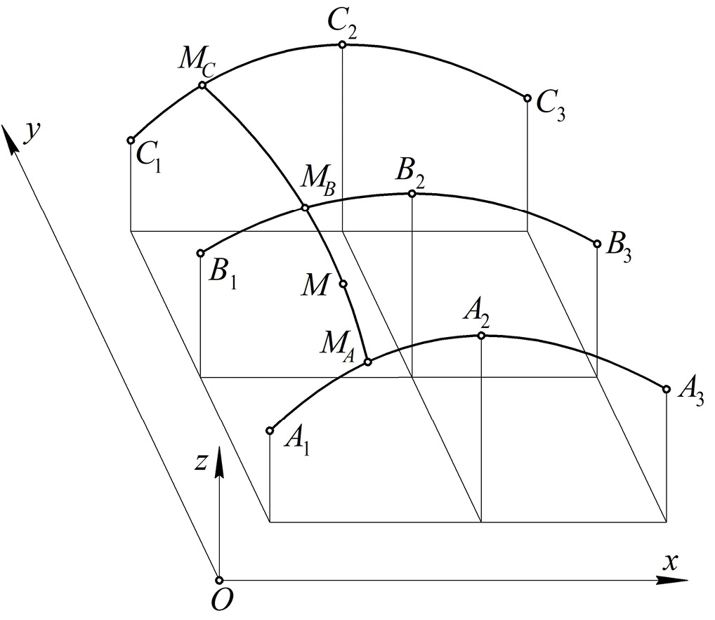 где M ‒ текущая точка отсека параболической поверхности; MA, MB, MC ‒ текущие точки направляющих параболических дуг; Ai, Bi, Ci ‒ исходные точки, координаты которых соответствуют исходной экспериментально-статистической информации; u и v ‒ текущие параметры отсека параболической поверхности; = 1 – u и = 1 – v ‒ дополнение текущих параметров до 1.