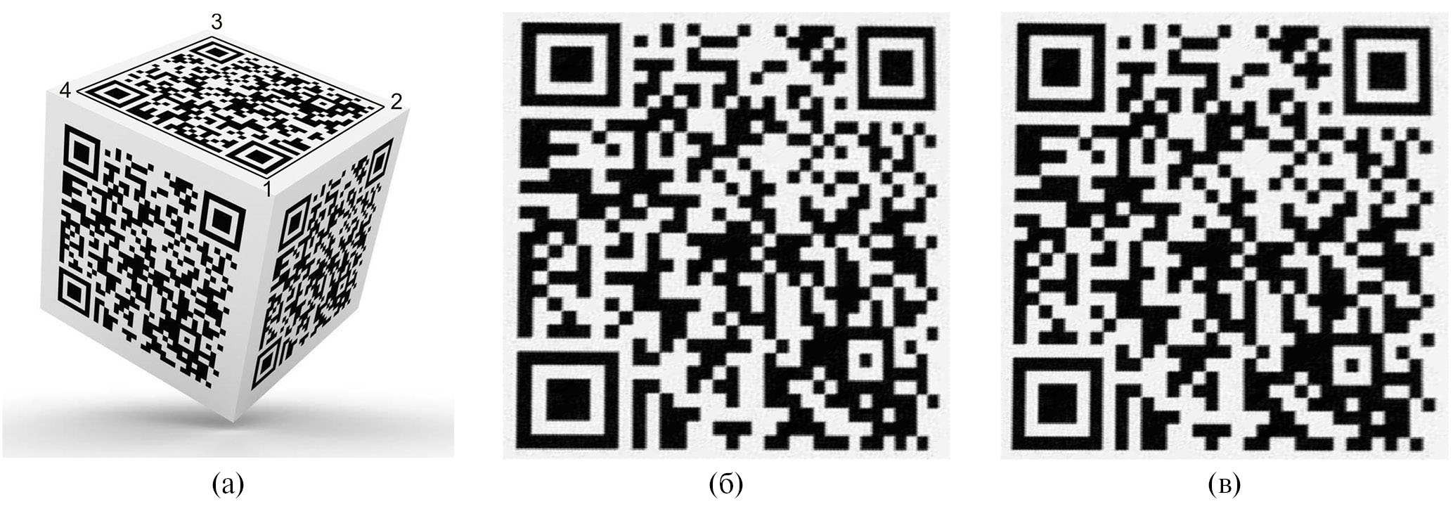 Рис. 2. Трансформация QR-кода (а), предварительно локализованного четырехугольником (1234) на верхней грани куба по формулам: (б) – (2), (в) – (3).