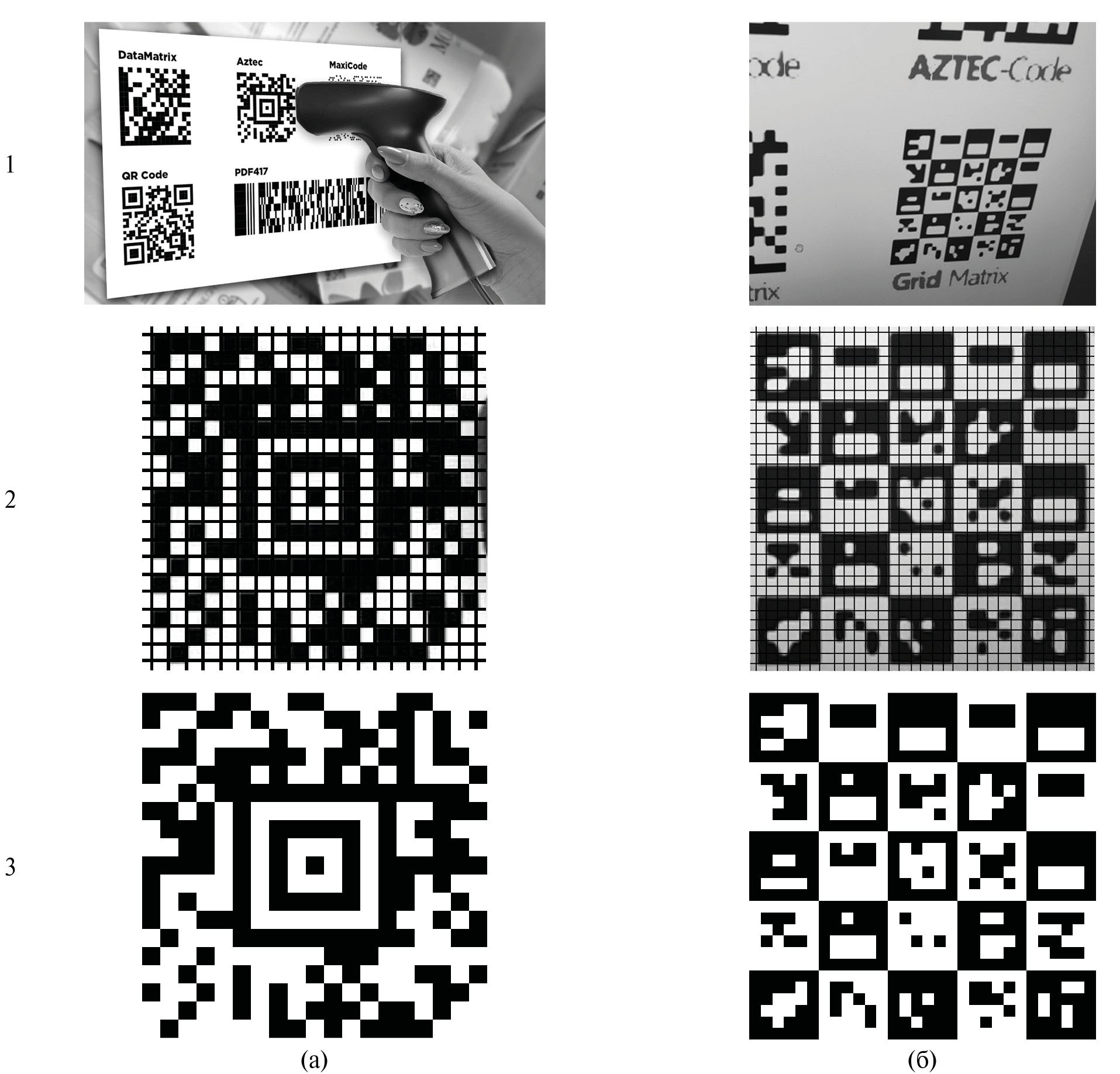 Рис. 4. Обработка двумерных кодов: (а) – Aztec, (б) – GridMatrix. Верхний ряд 1 – исходные изображения, средний ряд 2 – результат обнаружения, локализации, трансформации в канонический квадрат и дискретизации на модули двумерного кода, нижний ряд 3 – результат бинаризации модулей кода (двумерная последовательность 0 и 1).