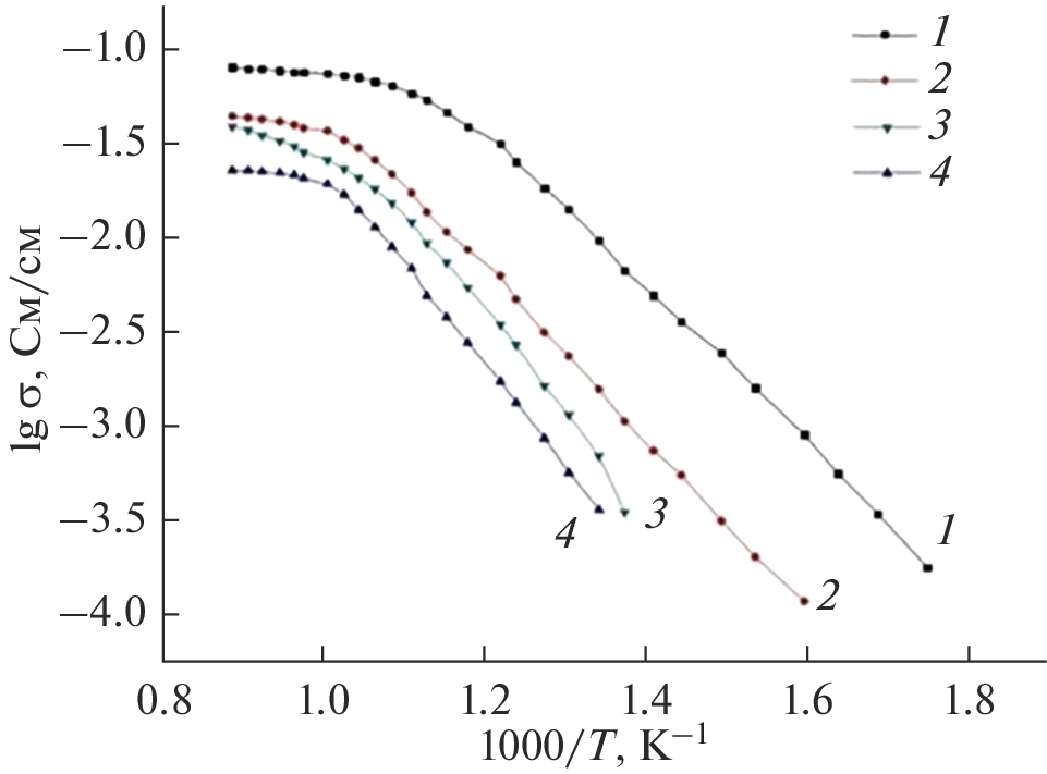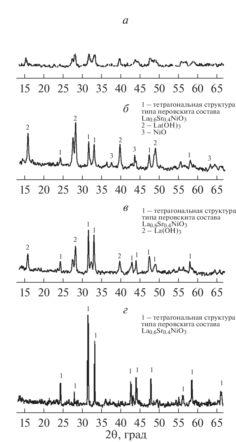 Finely dispersed mesoporous powders of the following composition are synthesized by the method of cocrystallization of nitrate salts with ultrasonic treatment: La1–xSrxNiO3–δ, La1–xSrxCoO3–δ, and La1–xSrxFe0.7Ni0.3O3–δ (x = 0.30; 0.40). Based on them, ceramic nanomaterials of the given composition with a coherent scattering region (CSR) of ~65–69 nm (1300°С) are obtained. Ceramics fired at 1300°C are single-phase and have a tetragonal and orthorhombic perovskite-type structure in the La2O3‒SrO‒Ni(Co,Fe)2O3–δ system. Solid solutions have mixed electron–ion conductivity with transfer numbers te = 0.98–0.90 and ti = 0.02–0.10. Ceramics with a tetragonal perovskite-type crystal structure exhibit higher electrical conductivity than materials having an orthorhombic perovskite-type crystal structure. According to their electrophysical properties related to the structural features of solid solutions, ceramic materials obtained based on them are promising as solid oxide cathodes for average-temperature fuel cells.