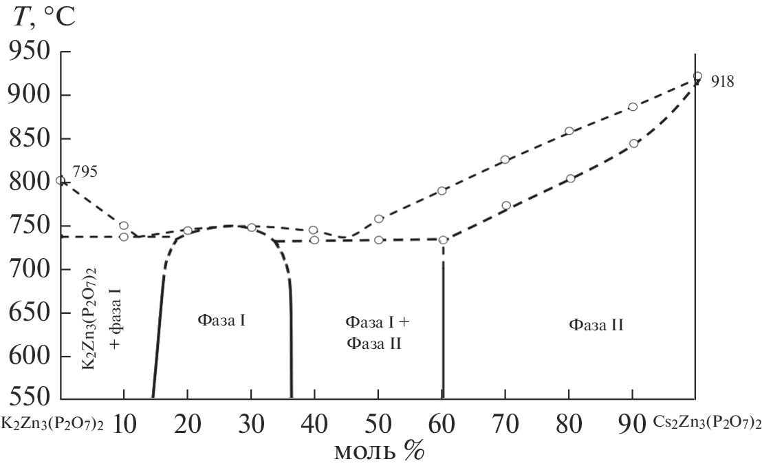 This article presents the results of a study of new solid solutions formed in the system of diphosphates of alkaline elements and zinc: K2Zn3(P2O7)2–Cs2Zn3(P2O7)2. The obtained materials are promising as matrices for creating phosphors. The formation of phases containing two alkali cations is established on samples obtained by solid-phase synthesis by X-ray phase analysis, and the results of studying their thermal stability are presented.
