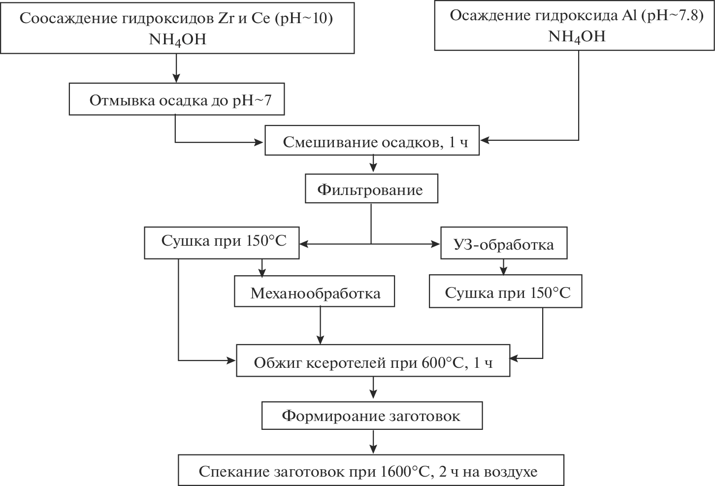 Xerogels and powders of a solid solution based on zirconium dioxide are synthesized by the method of coprecipitation of hydroxides from aqueous solutions of salts of zirconium nitrate ZrO(NO3)2⋅2H2O, aluminum Al(NO3)3⋅9H2O, and cerium Ce(NO3)3⋅9H2O with an aqueous 1 M solution of ammonia NH4OH. A dense ceramic with low porosity and water absorption is obtained. The effect of the ultrasonic treatment of the precipitate and mechanical treatment of the xerogel on the physicochemical properties of the obtained materials is evaluated.