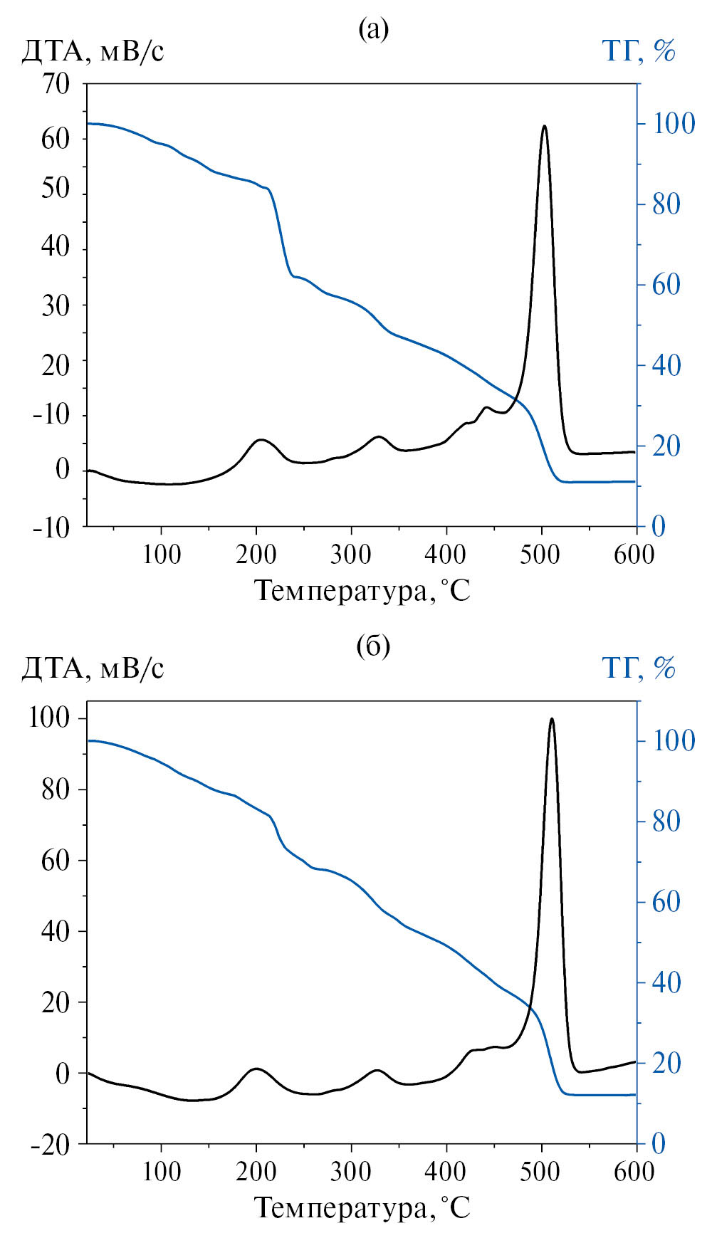 Рис. 1. Данные ДТА-ТГ анализа хода термической эволюции материалов при синтезе порошков Zn1 (а) и Zn2 (б), проведенном с использованием добавок ПВП.