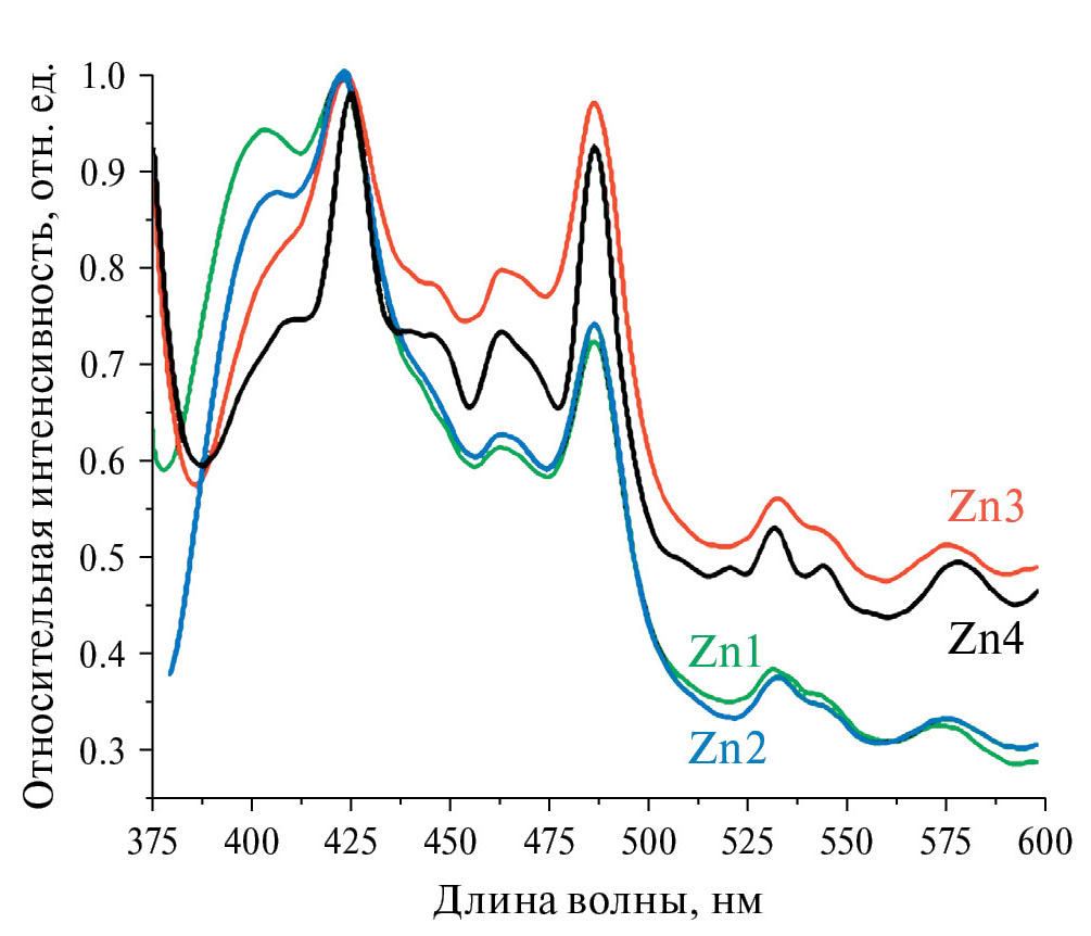 Рис. 4. Спектры фотолюминесценции образцов Zn1, Zn2, Zn3 и Zn4 при длине волны возбуждения люминесценции 356 нм.