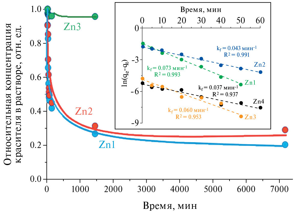 Рис. 5. Изменение относительной концентрации красителя в растворе при его адсорбции на поверхности порошков Zn1, Zn2, Zn3 и зависимости ln(qe–qt) = f(t), построенные на основании экспериментальных данных по адсорбции красителя на поверхности порошков Zn1, Zn2, Zn3 и Zn4.