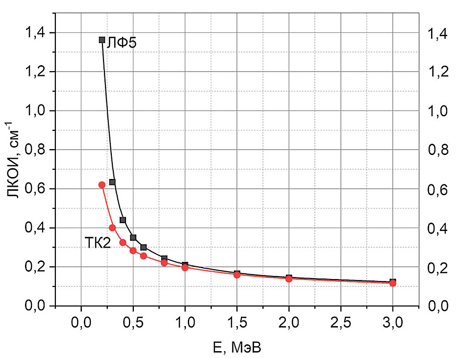 Установлено, что значения ЛКОИ стекол с оксидами бария и особенно свинца в их составе (флинты), в отличие от ЛКОИ стекол без этих оксидов (кроны), очень сильно изменяются при варьировании энергий квантов излучения от 0.2 до примерно 1.0 МэВ, тогда как в диапазоне энергий от 1.0 до 3.0 МэВ энергетические зависимости ЛКОИ стекол кроновой и флинтовой групп оказываются практически одинаковыми.