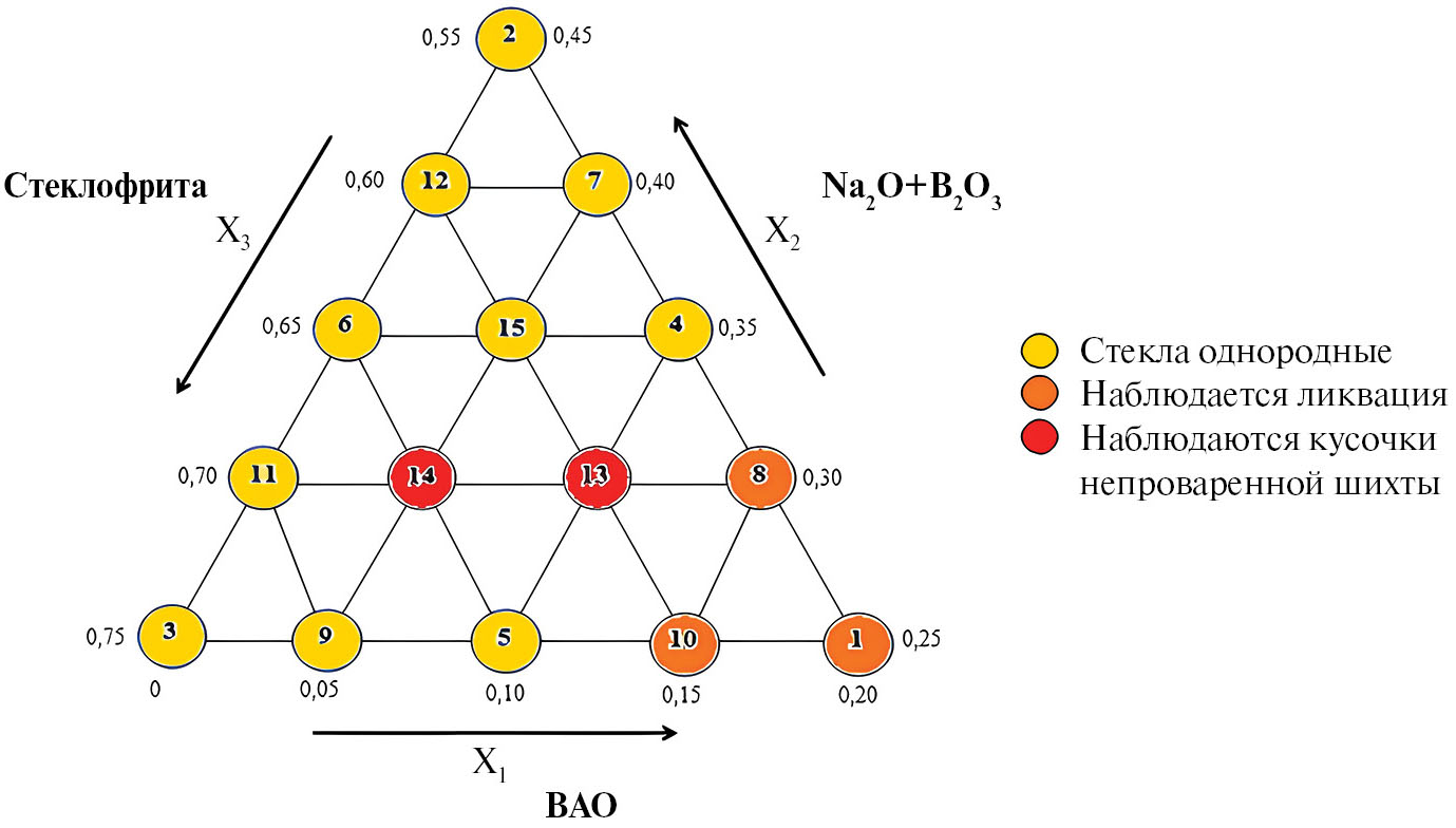 В поставленной задаче оксиды имитатора высокоактивных отходов, включающие оксиды многовалентных катионов (МеnОm), объединили в одну группу. При таком подходе задача сводится к исследованию трехкомпонентной системы, которая включала в себя следующие компоненты или их группы: стеклофритта, оксиды имитатора высокоактивных отходов, смесь оксидов натрия и бора.