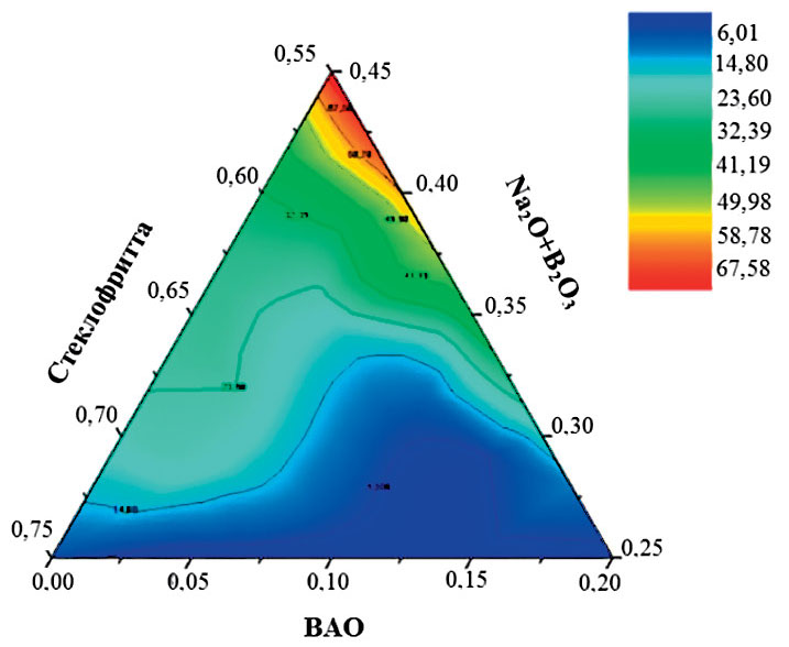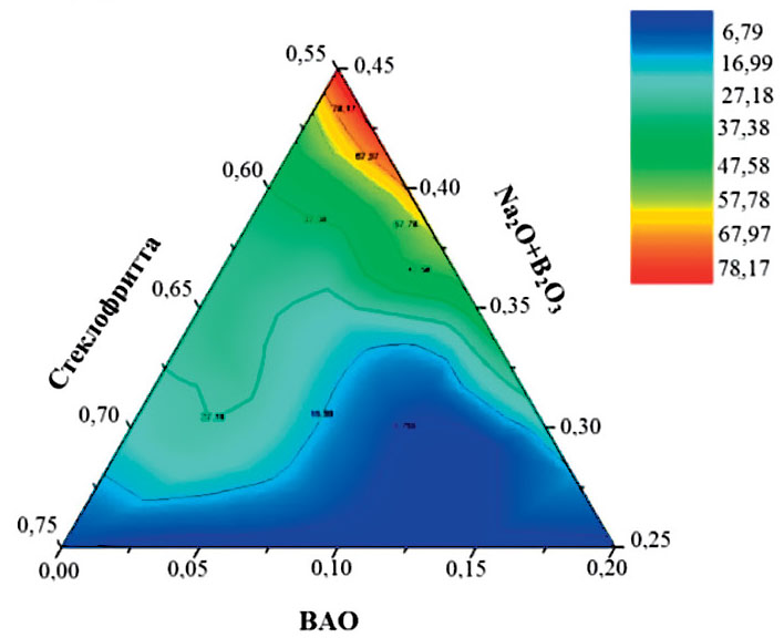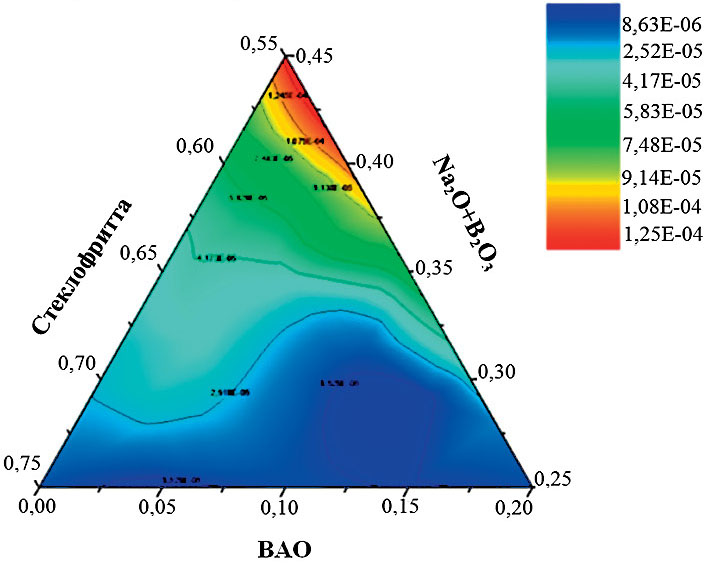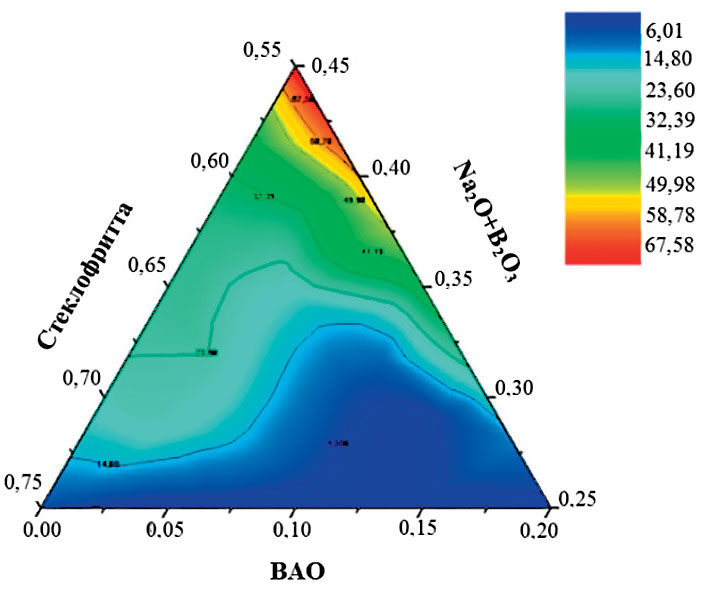 Наиболее высокие показатели выщелачивания кремния характерны для области с массовой долей оксидов натрия и бора от 40 до 45%, стеклофритты — от 55 до 60%, ВАО — от 0 до 5%.