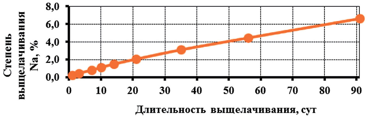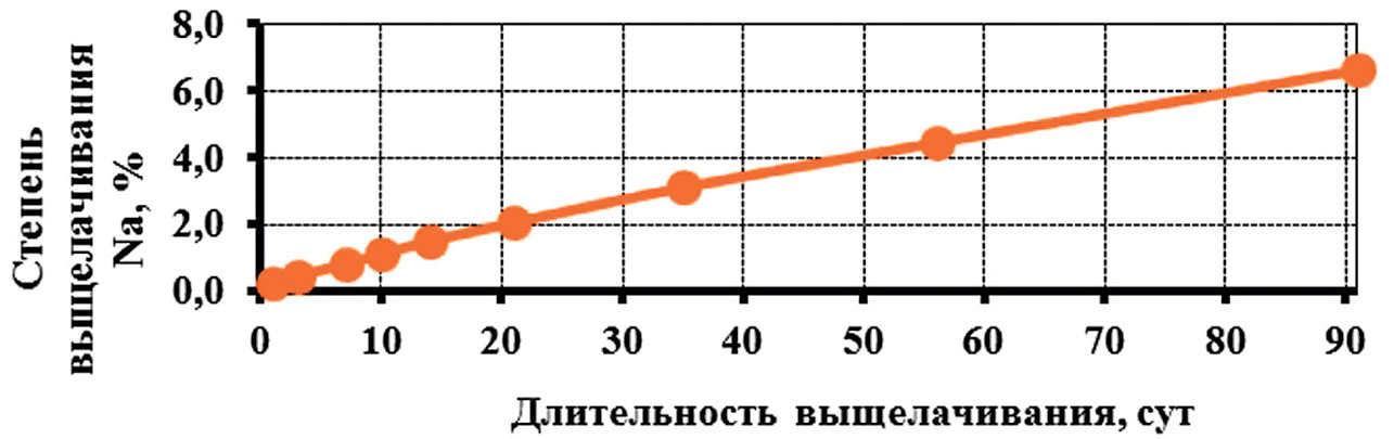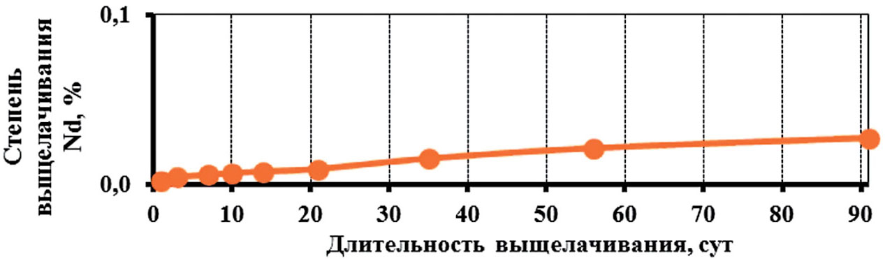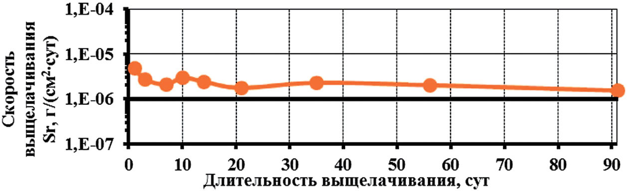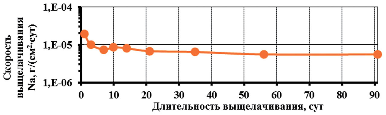 Исследование выщелачивания натрия и бора показывают, что по своей подвижности они близки друг к другу. Наиболее устойчиво в боросиликатных матрицах закреплен редкоземельный элемент — неодим. Так, скорость выщелачивания неодима из стекол уже на первые сутки составляет 1.8∙10–7 г/(см2∙сут), что на один порядок ниже показателей выщелачивания остальных элементов.
