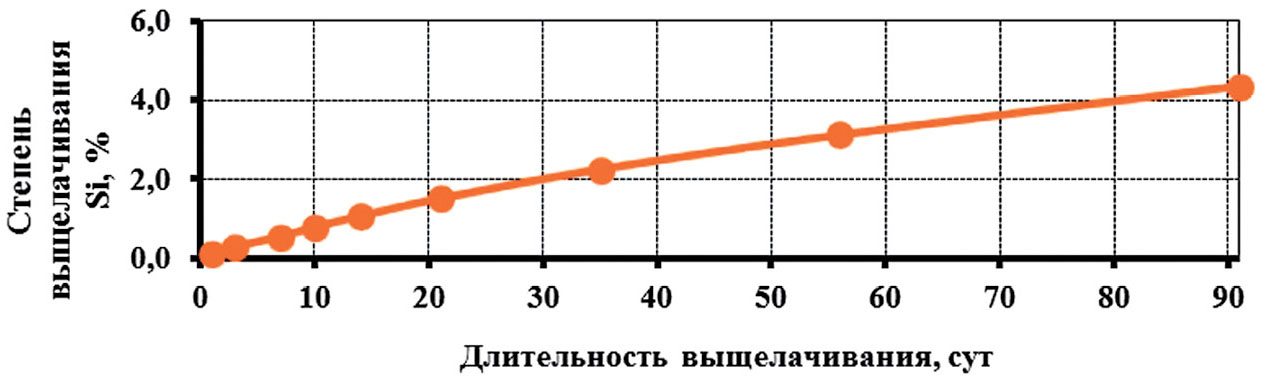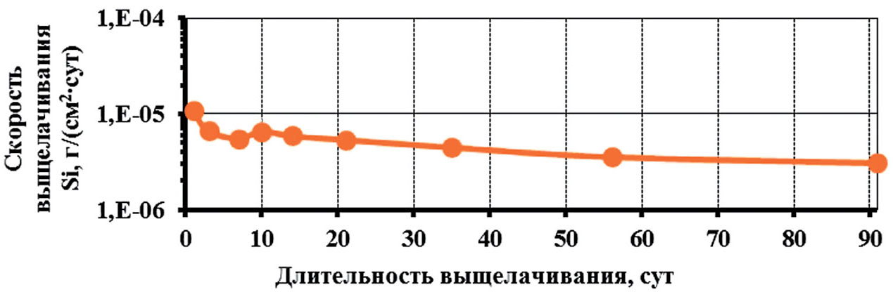 Выщелачивание кремния рассматривалось для общего понимания устойчивости боросиликатной матрицы. Скорость выщелачивания данного элемента из закаленного стекла состава № 13 на первые сутки составляет 1.1∙10–5 г/(см2∙сут). Степень выщелачивания кремния за 91 сут не превышает 4.4%.