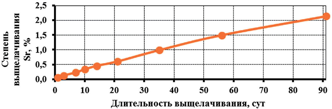 Скорость выщелачивания стронция из закаленного стекла состава № 13 отклоняется от нормативной величины (1∙10–6 г/(см2∙сут)) и составляет 5.0∙10–6 г/(см2∙сут). По истечении 7 сут и более скорость выщелачивания стронция постепенно приближается к граничному значению, степень выщелачивания за 91 сут — 2.1%.
