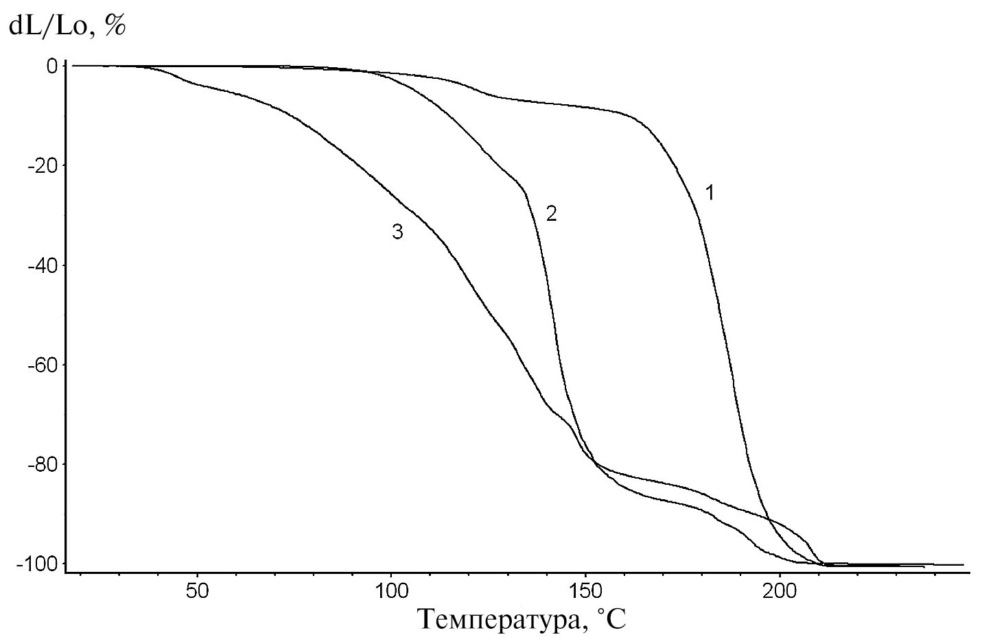 Условия синтеза оказывают влияние не только на температуру стеклования аморфной фазы, но и на температуру размягчения и текучести высокотемпературной фракции (рис. 7).