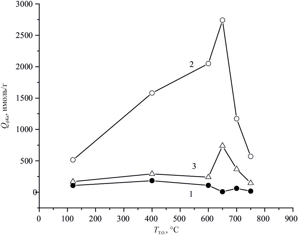 Рис. 1. Зависимость содержания центров адсорбции Q(pKa) от температуры термообработки пористого стекла Тт.о:. 1 – БОЦ (рКа 8,8); 2 – БКЦ (рКа 2.5); 3 – ЛОЦ (рКа –0,3)