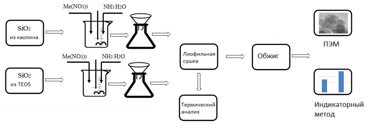 По второму способу (рис. 1) в качестве прекурсора оксида кремния был использован тетраэтоксисилан (TEOS). Для перевода TEOS в оксид кремния применяли водный раствор аммиака. Смесь со всеми компонентами нагревали до 60–70 °C при постоянном перемешивании в течение 1 ч. Гель промывали водой до нейтральной среды и сушили лиофильной сушкой. Полученный порошок подвергали термической обработке при температуре 750 °С в течение 4 ч.