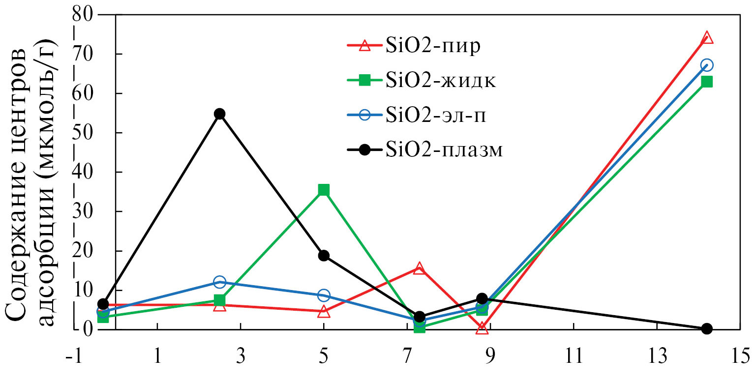Среди исследуемых образцов диоксида кремния следует отметить образцец SiO2-плазм, характеризующийся явным преобладанием БКЦ с рКа 2.5, что соответствует наблюдаемому слабокислому характеру поверхности с плавным снижением рН. У образца SiO2-пир наблюдается повышенное содержание нейтральных центров Бренстеда, что соответствует близкому к нейтральному характеру поверхности по данным кинетики изменения рН [22]. На поверхности образца SiO2-эл-п наблюдается преобладание кислотных центров обоих типов (БКЦ и ЛКЦ), что обусловливает наблюдаемое снижение рН [22].