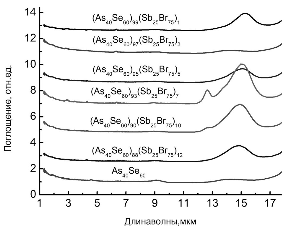 С повышением содержания SbBr3 изменяется величина поглощения в районе длин волн от 11 до 17 мкм, обусловленного примесями оксида мышьяка в форме As-O-As (15.4 мкм). Эти изменения не носят систематического характера, и появление примесных полос можно объяснить частичным гидролизом SbBr3 (SbBr3 + H2O = SbOBr + 2HBr), при работе с ним на воздухе и обменом примесным кислородом и селеном матрицы стекла между атомами сурьмы и мышьяка.