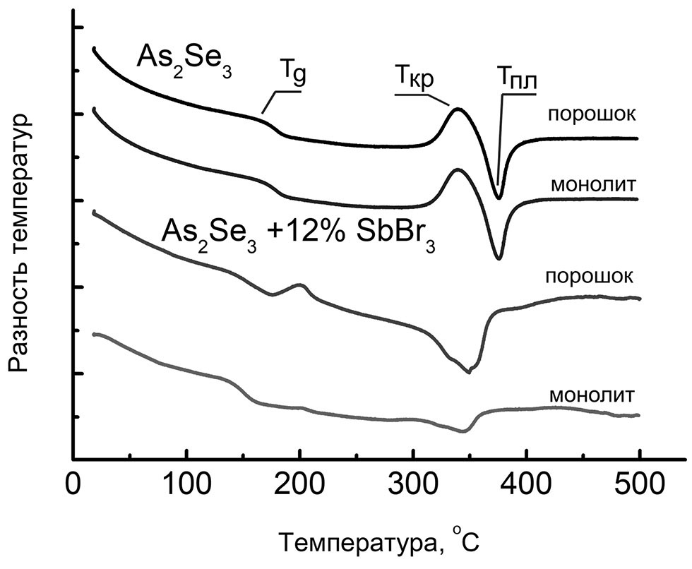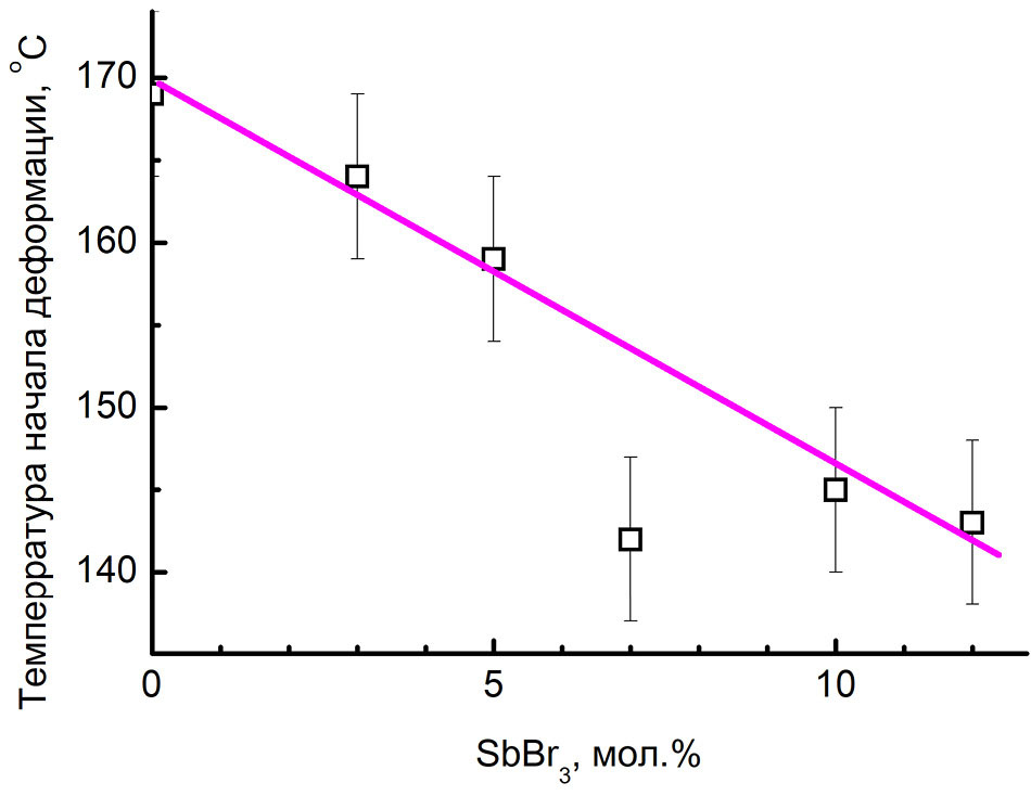 Температура начала деформации стекол AsxSe100-x растет от 70 до 225 °С при увеличении концентрации мышьяка от 5 до 25 мол. %. При введении бромида сурьмы температура начала деформации слегка понижается от 170 до 140 °С при увеличении концентрации бромида сурьмы до 12 мол. % в стеклах (As20Se80)100-x(Sb25Br75)x (рис. 5). Стекла при этом не кристаллизуются.