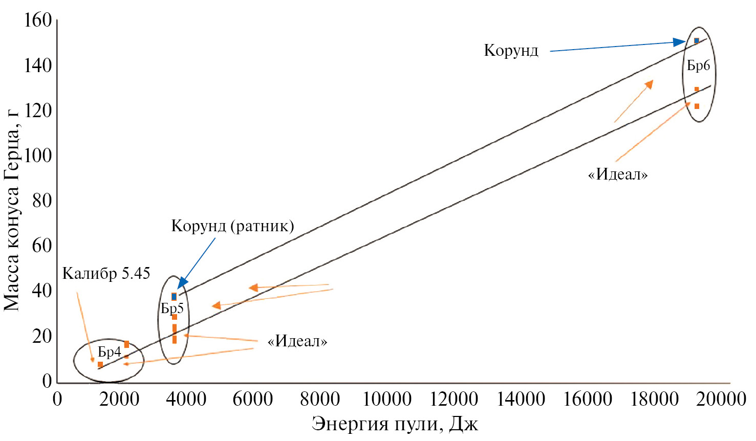 Из данных рис. 3 следует, что масса сформировавшегося конуса Герца прямо пропорциональна кинетической энергии индентора, которая определяется массой и скоростью индентора по формуле (2). Масса конуса для керамических пластин из «Идеала» меньше, чем для корундовых пластин, при одинаковой энергии индентора, что говорит о большей энергоемкости этого материала по сравнению с корундом.