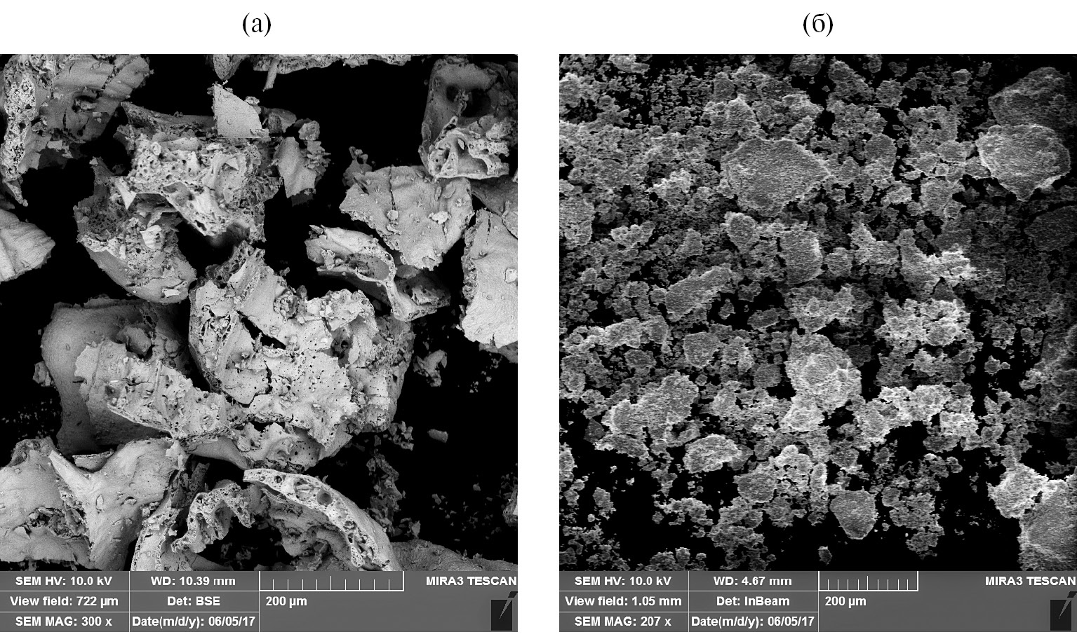C использованием СЭМ была изучена морфология порошков и определены средние размеры агломерированных частиц. Размеры агломератов для серии 1 находятся в пределах от 20 до 200 мкм и представляют собой малопористые сросшиеся образования с грубой поверхностью, а для серии 2 – рыхлые, высокопористые частицы с размерами 10–50 мкм.