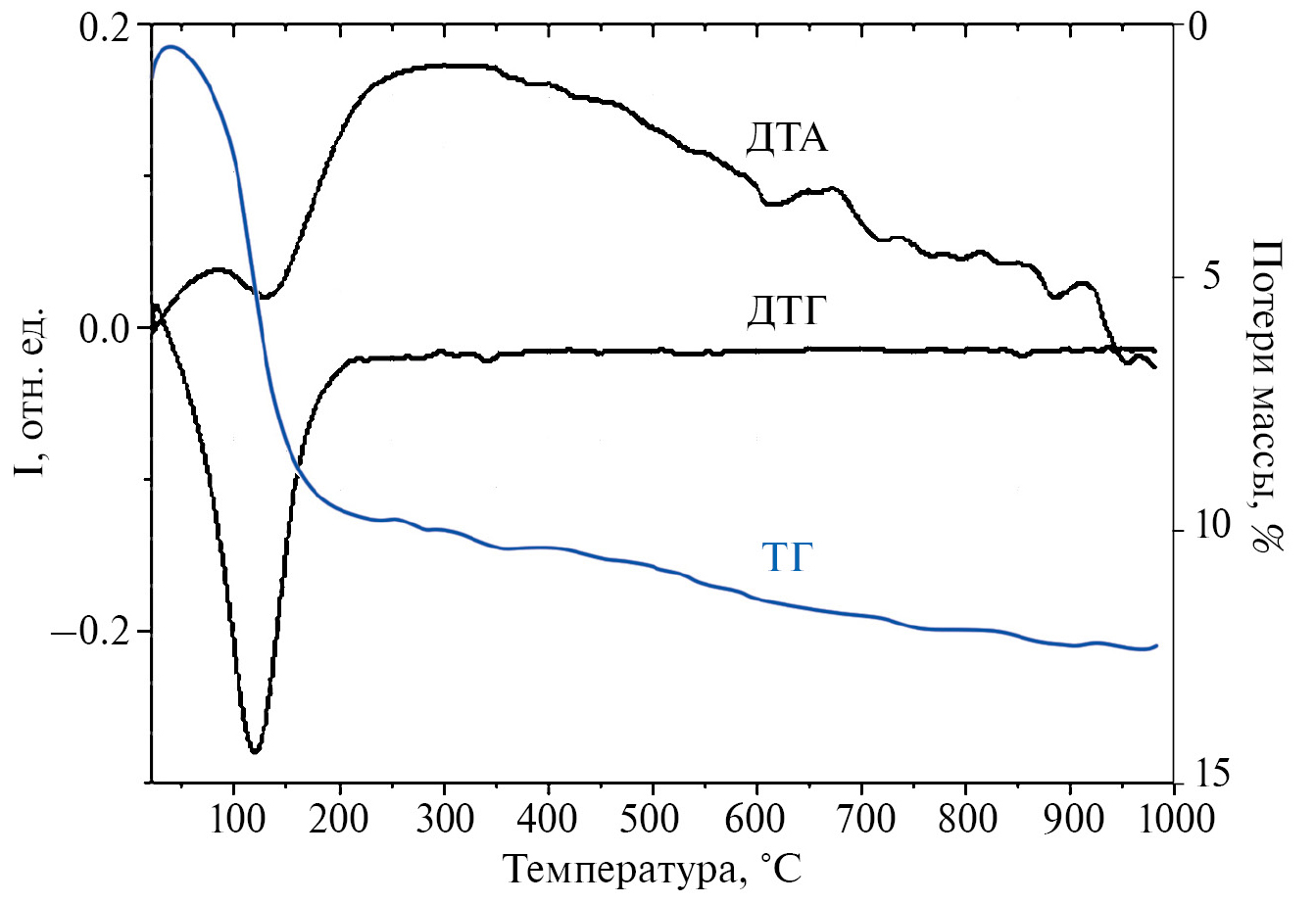 На рис. 2 представлены кривые ДТА, ДТГ и ТГ, полученные при нагревании гелеобразного продукта, формируемого при нагреве смеси азотнокислых солей при недостатке в смеси лимонной кислоты. На кривых потери массы имеются четыре ступени, границы которых можно определить по кривым ДТГ. На первом участке потери массы в температурном интервале 20–120 °С происходит медленное удаление адсорбированной и кристаллизационной воды, сопровождающееся эндотермическим эффектом [22]; на втором участке (200–350 °С) наблюдаются экзотермические процессы, которые обусловлены окислительно-восстановительными реакциями, проходящими при нагреве геля и сопровождающимися медленной потерей массы, при этом происходит удаление органических примесей и остатков воды. На третьем участке (400–650 °С) происходит уплотнение частиц и начало формирования аморфно-кристаллической структуры (экзотермический эффект при 650–670 °С). При 700–900 °С (четвертый участок) наблюдается рост микрокристаллов (слабый экзотермический эффект) с незначительной потерей массы за счет удаления остаточных гидроксил- и азотсодержащих компонентов.