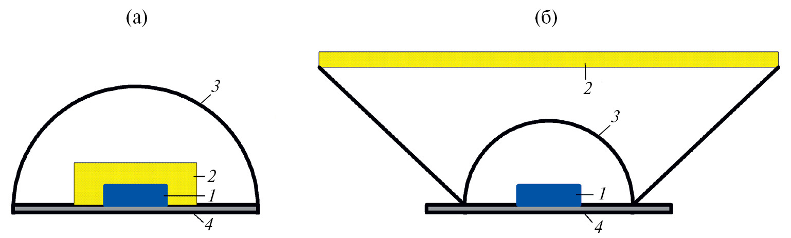 Рис. 6. Варианты расположения удаленных люминофорных преобразователей относительно кристалла или матрицы светоизлучающего диода (СИД): а – плоская форма (1 – светодиод, 2 – линза, 3 – фотопреобразователь, 4 – корпус); б − полусферическая форма (1 – светодиод, 2 – фотопреобразователь, 3 – защитное стекло, 4 – корпус).