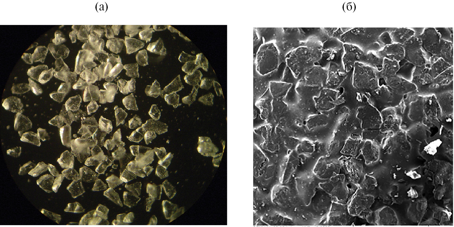 Рис. 7. Порошок кварцевого стекла: а – после отмывки в УЗ-ванне; б – в составе композита. Увеличение – × 200.