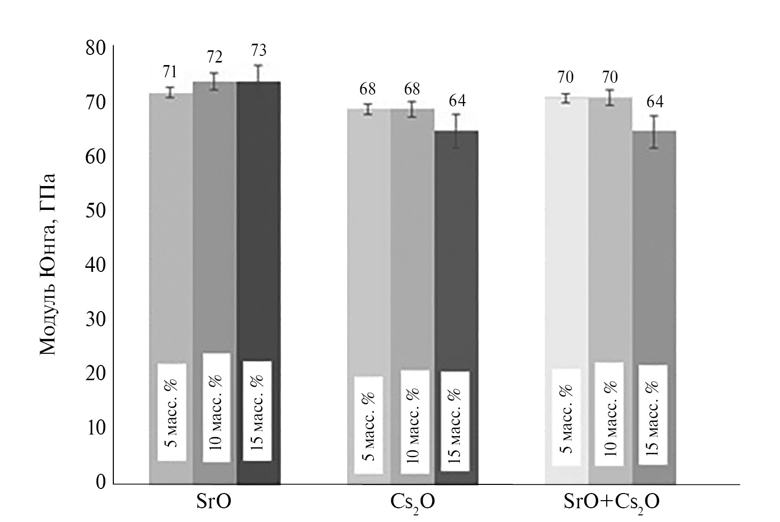 Значения модуля Юнга для всех исследованных стекол находятся в интервале (6.5–7.5) ∙ 1010 Па, по нормам НП-019-15 это значение не должно быть менее 5.4 ∙ 1010 Па [20].