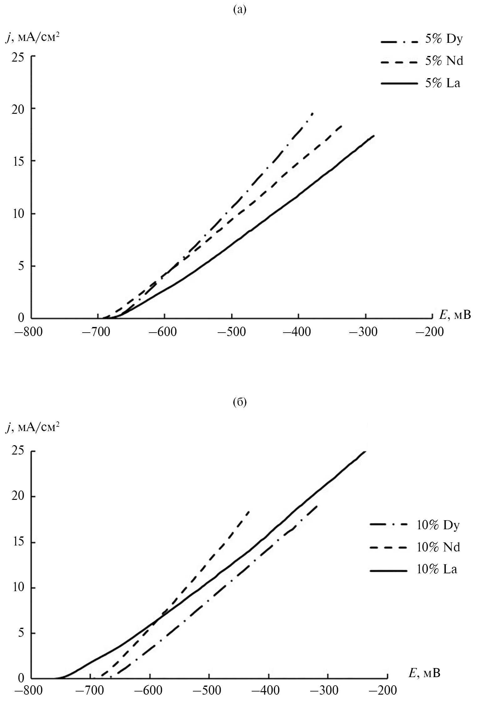 Для оценки эффективности электрогенерирования ионов алюминия(III) оценивали кинетику растворения алюминиевого анода методами поляризационных кривых и хронопотенциограмм в исследуемых растворах 5 и 10 мас. % с содержанием РЗЭ. Следует заметить, что характер кривых (рис. 1) практически идентичен, все они демонстрируют достаточно активное растворение анода. Отличие заключается в электрохимическом поведении алюминиевого электрода в зависимости от содержания ионов РЗЭ в растворах эквимолярного состава с одинаковым соотношением базовых компонентов. Они демонстрируют разный характер, что косвенно указывает, в том числе, на влияние природы катионов. Для сравнения в качестве реперного использован раствор, содержащий 5 и 10 мас. %. Al(III), при этом наблюдается отличие в наклоне и стационарном потенциале поляризационных кривых.