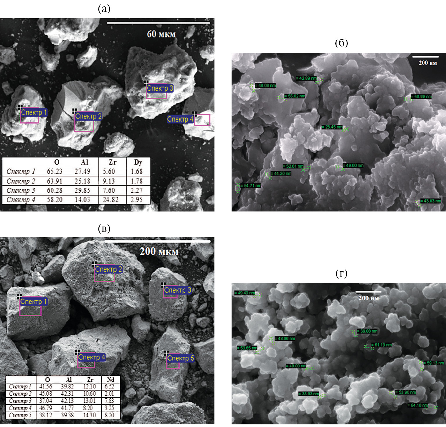 Размеры частиц прекурсоров оксидных систем с неодимом, полученных из растворов с 10%-ной массовой концентрацией ионов этого элемента в электролите, крупнее по сравнению с таковыми, полученными из растворов с 5%-ной массовой концентрацией. Такого различия не наблюдается в случае прекурсоров оксидных систем c диспрозием, полученных из электролитов с аналогичной концентрацией. Результаты измерений размеров частиц, полученные с помощью сканирующей электронной микроскопии и локального элементного анализа поверхности образцов, приведены на рис. 3. Локальная концентрация редкоземельных элементов на поверхности частиц может варьироваться в достаточно широких пределах. Наибольшее содержание РЗЭ на отдельных участках поверхности частиц зафиксировано у оксидных систем, содержащих неодим. Кроме того, можно отметить несколько меньший размер агрегатов у образцов, содержащих диспрозий (25–55 нм), по сравнению с таковым у частиц образцов, содержащих неодим (40–60 нм и более), и достаточно сильно различающиеся формы частиц: имеющая более четко выраженные грани у частиц алюмоциркониевооксидных систем с диспрозием (рис. 3а, б) и более сглаженная у частиц оксидных систем с неодимом (рис. 3в, г).