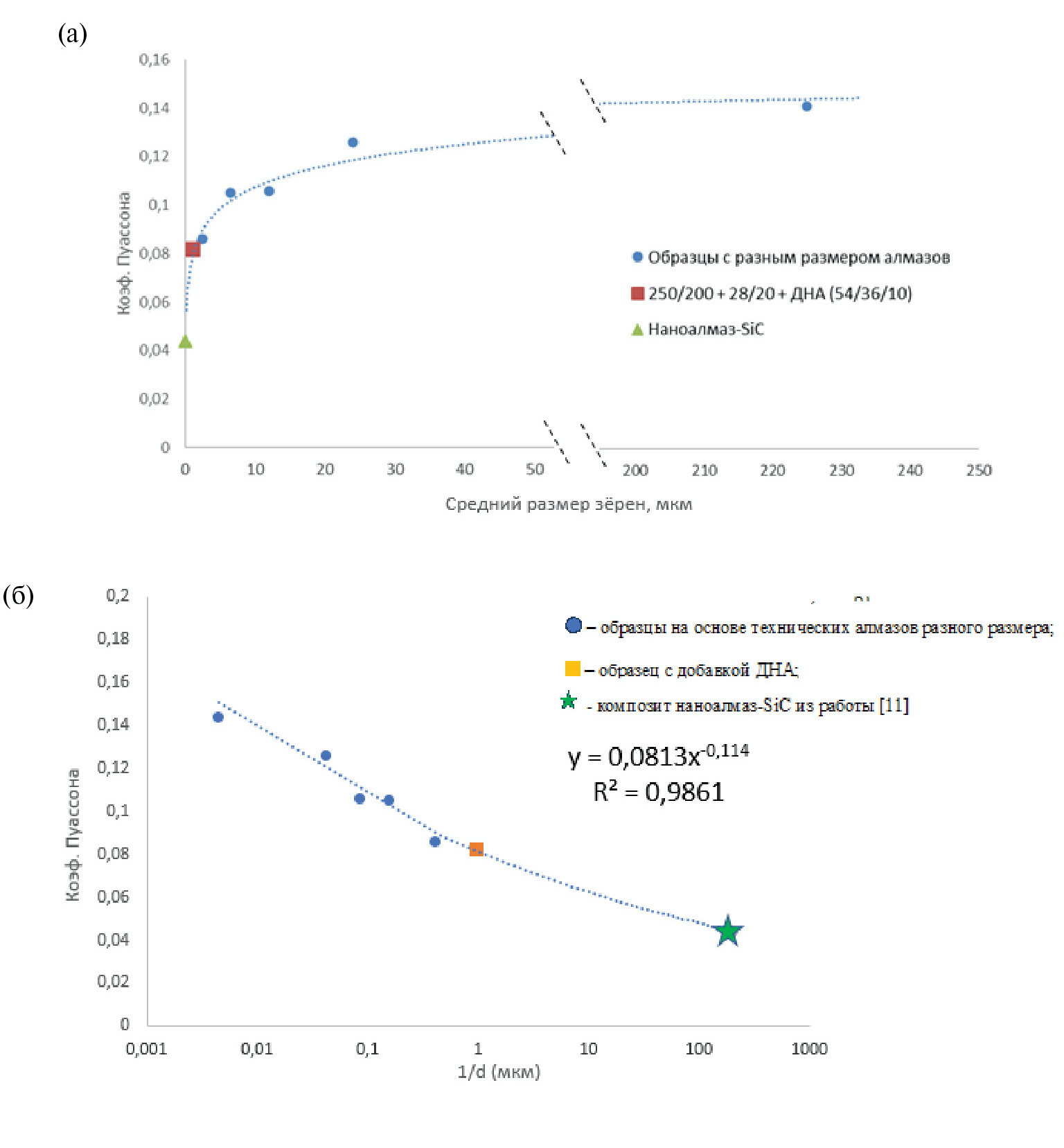 На рис. 1 представлена зависимость коэффициента Пуассона от среднего размера зерен алмаза в композиции. Отдельно выделена (квадратная точка) керамика, полученная из смеси с добавлением детонационных наноалмазов. Из рисунка следует, что при уменьшении размера зерна технического алмаза коэффициент Пуассона алмаз-карбид кремниевого композиционного материала снижается. Все точки ложатся на общую зависимость. Необходимо отметить, что в работе [7] для алмаз-карбид кремниевого композита полученного из полидисперсного алмазного порошка было получено еще более низкое значение коэффициента Пуассона – 0.0080.
