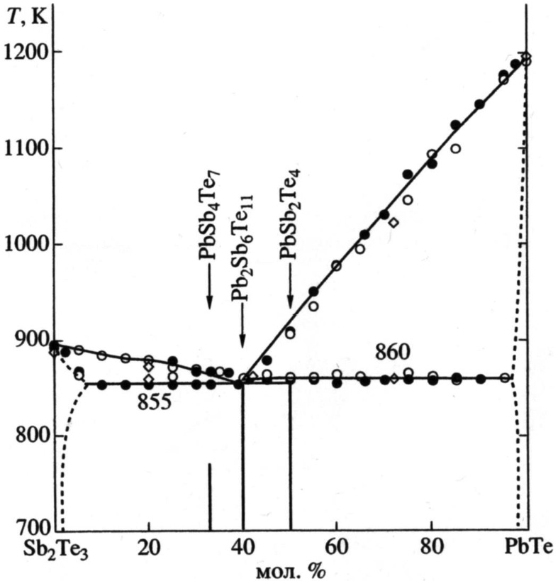 По данным работы [12] в квазибинарной системе (PbTe + Sb2Te3) также может образовываться тройное соединение Pb2Sb6Te11 с инконгруэнтным плавлением при 860 К.