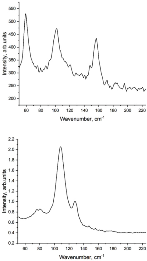 Выполненные нами измерения спектров КРС подтвердили существование дополнительной фазы в слитках. Спектры комбинационного рассеяния света измерялись с использованием спектрометра исследовательского класса T64000 (Horiba). Спектрометр оснащен микроскопической приставкой, что позволяет измерять локальные спектры с поверхности образцов диаметром 1 мкм, и тройным монохроматором, обеспечивающем возможность регистрации спектров в низкочастотной области вплоть до 5 см–1. При использовании тройного монохроматора не требуется введение в канал регистрации краевого фильтра, отрезающего лазерную линию возбуждения, что и обеспечивает возможность измерения спектров в области менее 100 см–1. В качестве источника возбуждающего излучения использовался непрерывный лазер с длиной волны генерации 532 нм и максимальной мощностью 100 мВт. Лазерное излучение фокусировалось на поверхности образца при помощи 50× микрообъектива в область площадью около 4 мм2. Для измерения спектров КРС готовились свежие сколы вдоль плоскостей слоистых структур.