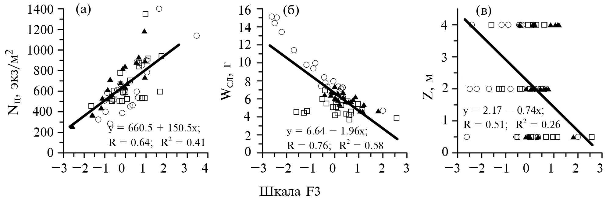 На третью главную компоненту значимое влияние оказывают глубина обитания макрофитов и параметры популяции цистозиры – NЦ и WСЛ (рис. 6). Их общий вклад в дисперсию F3 составляет 78%. Увеличение F3 соответствует снижению глубины, увеличению плотности популяции и уменьшению средней индивидуальной массы слоевища цистозиры. Таким образом, F3 отражает батиметрическую структуру популяции E. crinita, что подтверждает опубликованные ранее данные (Ковардаков, Павшенко, 2022). Мы не стали исключать из обработки низкий коэффициент детерминации (R2 = 0.26) в уравнении, описывающим связь глубины обитания макрофитов с F3 (рис. 6в), так как при интерпретации результатов факторного анализа величина R2 = 0.20 считается приемлемой (Comrey, Lee, 1992). Известно, что структура ценопопуляций цистозиры также зависит от подвижности воды в биотопе (Хайлов, Парчевский, 1983), но в настоящем исследовании эта переменная не учитывалась.