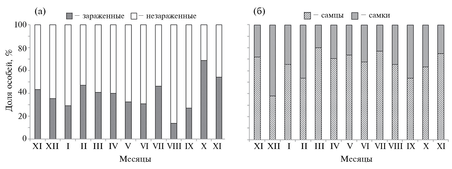 У значительной части особей Pagurus middendorffii, исследованных за период наблюдений, на плеоне обнаружены паразитические ракообразные. Корнеголовый рак Peltogasterella gracilis отмечен у 97.37% от общего числа зараженных раков-отшельников, остальные инфицированы паразитической изоподой Athelges takanoshimensis, единично встречавшейся в августе–ноябре (табл. 1). Раки-отшельники с экстернами Rhizocephala на плеоне встречались на протяжении всего периода наблюдений, их доля от общего числа исследованных животных варьировала от 7% в январе до 68% в октябре (рис. 2а). Особи с экстернами паразита отсутствовали только в пробе за 6 сентября. Общая доля зараженных особей среди всех исследованных раков-отшельников составила 37.99%.