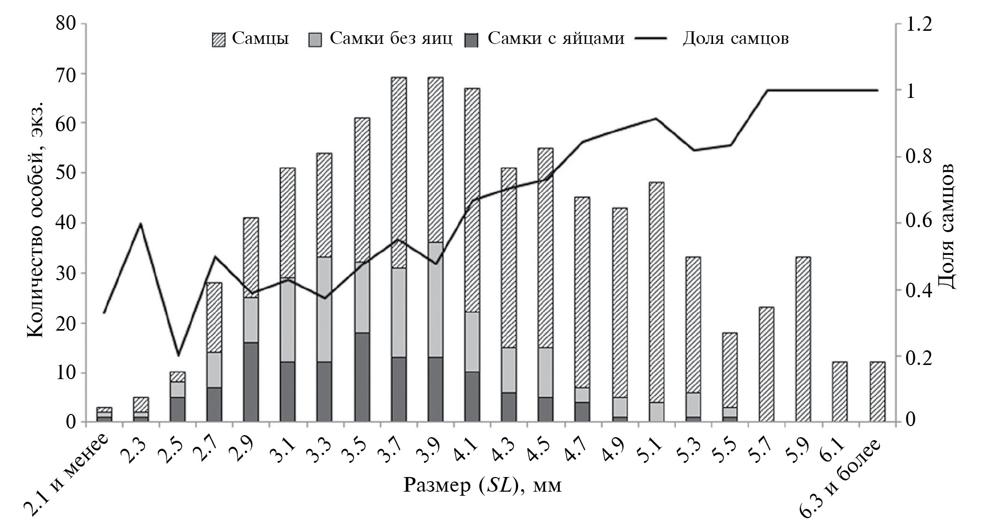 Среди здоровых особей соотношение самцов и самок изменялось в течение периода исследований от 0.6 в декабре 2022 г. до 4.0 в марте того же года и в среднем составило 2.2 (рис. 2б). Размеры самцов (n = 519 экз.) варьировали в диапазоне от 1.9 до 6.6 мм (в среднем 4.53±0.95 мм), самок (n = 289 экз.) – от 1.9 до 5.5 мм (в среднем 3.67±0.68 мм) и яйценосных самок – от 1.9 до 5.3 мм (в среднем 3.56±0.62 мм). Самки, как правило, были представлены особями размером от 2.3 до 5.3 мм (93%), самцы – от 2.7 до 6.3 мм (96.5%) (рис. 3).