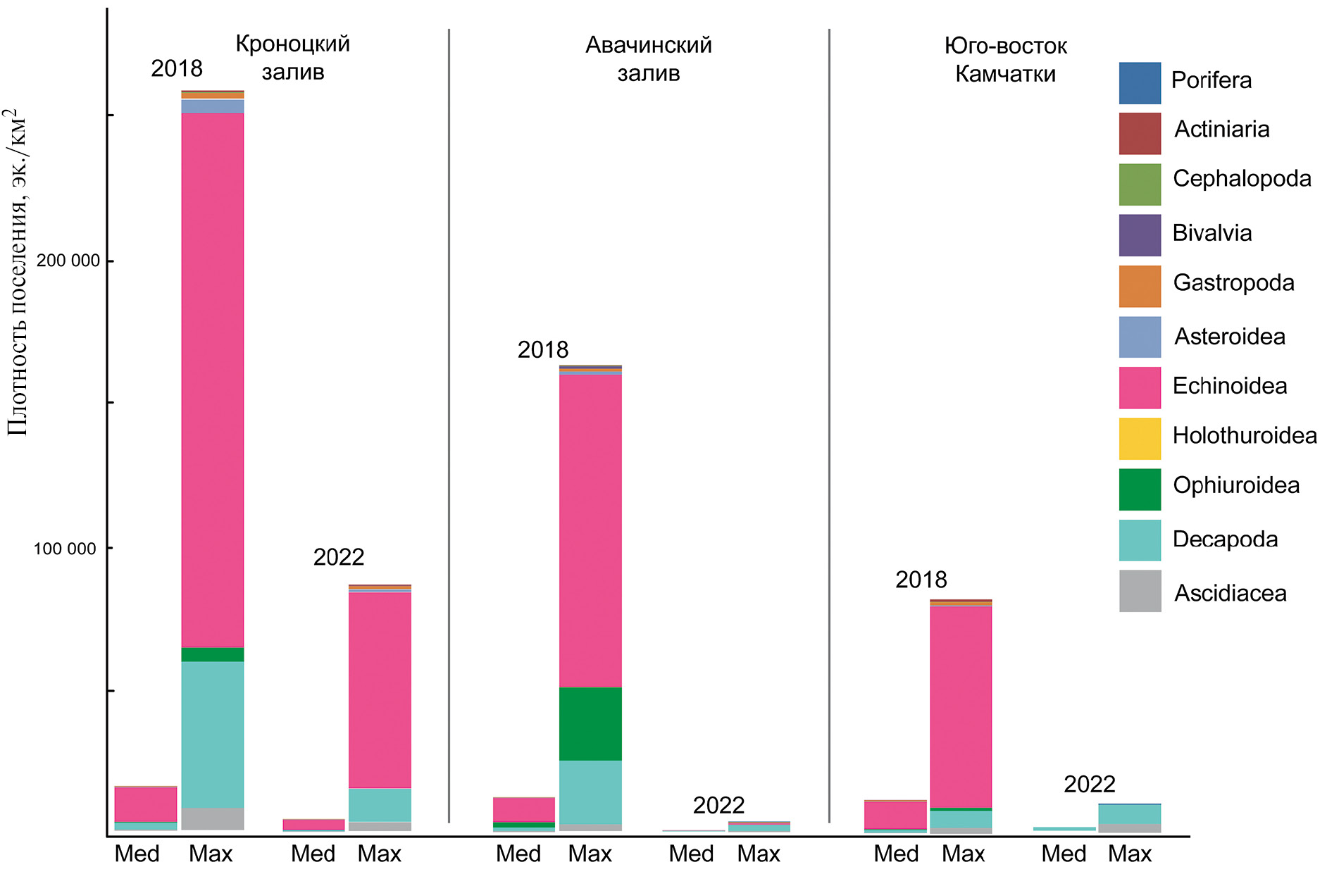 Средняя и максимальная плотность поселения (экз./км2) в 2022 г. сильно сократились (от полутора–двух раз до нескольких порядков) во всех группах, кроме Porifera и Decapoda на шельфе юго-восточного побережья Камчатки южнее мыса Поворотный (рис. 9). Там же отмечено увеличение в 1.5 раза максимальной плотности поселения Ascidiacea, а на шельфе Кроноцкого залива – увеличение в 2 раза максимальной плотности поселения Bivalvia (табл. 1, 2).