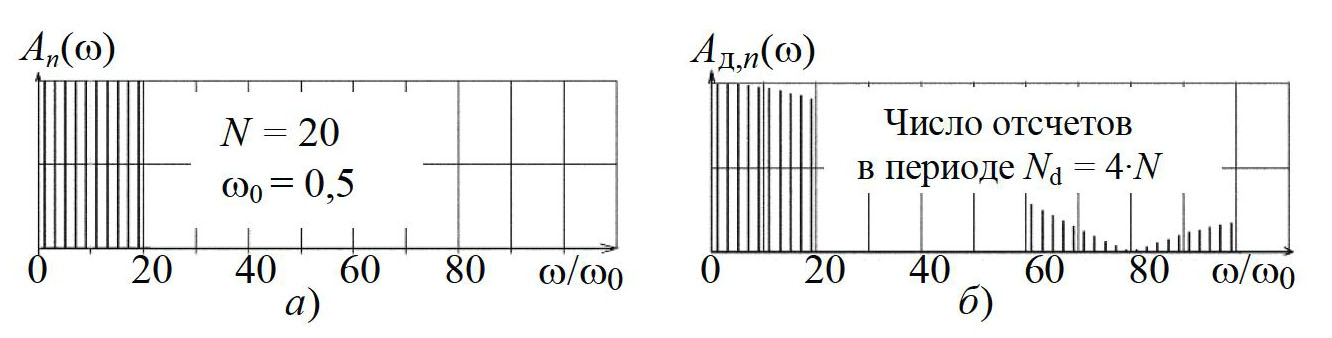 При поддержании равенства (4) при «оцифровке» РАП (24) в результатах ДПФ функции (23) ожидается следующее (рис. 11):
