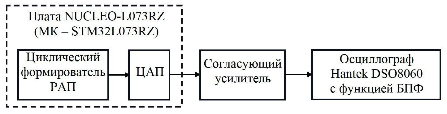 Так как в рамках статьи не ставилась задача оценки технических возможностей предлагаемого метода, то скрупулезной оценки шага дискретизации относительно условия (21) не приведено. Известно только – при встроенных в микроконтроллер STM32L073 (см. рис. 3) ЦАП и АЦП он должен быть меньше 25 мкс.