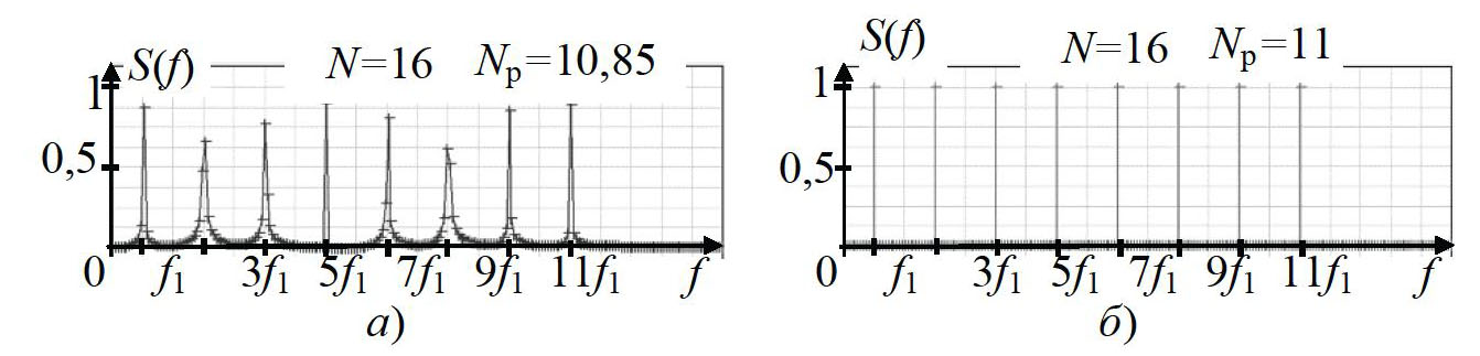 Рис. 5. Спектры при нецелом (а) и целом (б) числе периодов