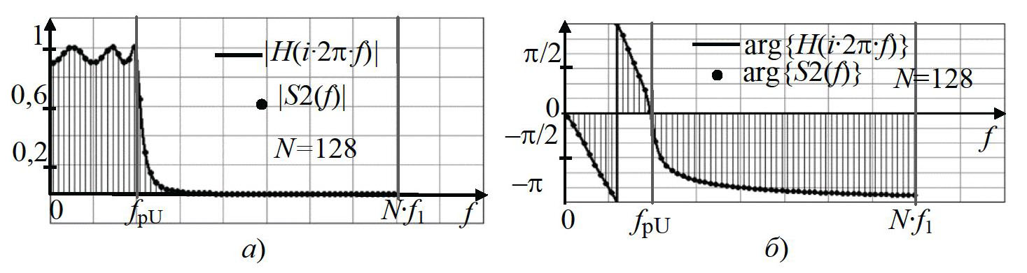 Соответственно, при выполнении условий (4), (5) и (20) не проявляется растекание спектра и уменьшается погрешность ДПФ установившейся функции отклика исследуемого ФНЧ, улучшается точность анализа ЧХ (рис. 8).