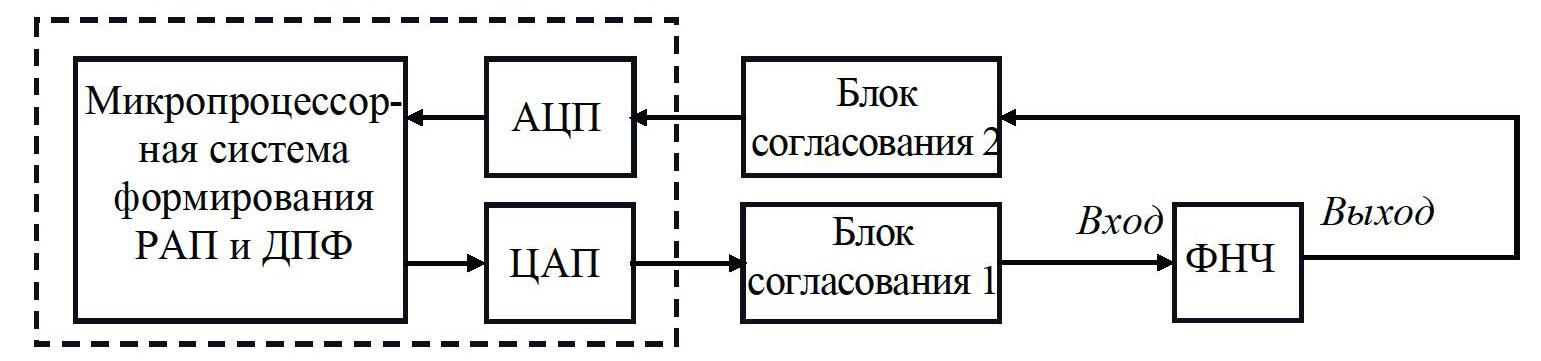 Обеспечить выполнение условий (4), (5) и (20) проще, если и формирование РАП и ДПФ отклика будут выполняться в одном микропроцессорном устройстве (рис. 9), фиксируя k-й отсчет отклика ФНЧ через АЦП непосредственно после установления напряжения k-й выборки РАП на выходе ЦАП. Для корректного функционирования системы необходимо выполнение условия