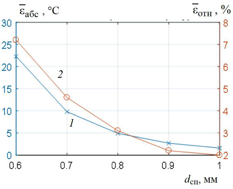 Рис. 4. Влияние диаметра спирали на абсолютную (1) и относительную (2) погрешности расчета температуры спирали при ее нагреве