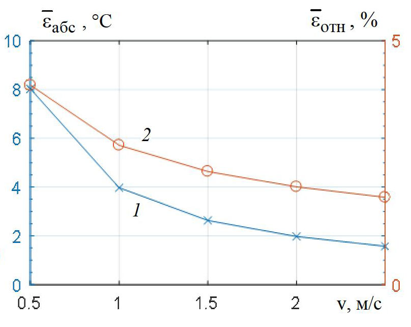 Рис. 6. Влияние скорости воздуха на абсолютную (1) и относительную (2) погрешности расчета температуры спирали при ее нагреве